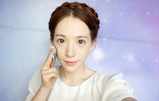 底妆是比较有光泽感的,首先使用气垫粉扑底液轻拍面部,打造自然透亮的皮肤。