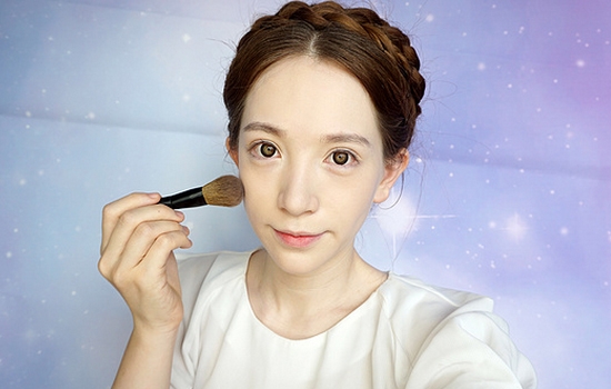 定妆部分使用的是nars的裸光蜜粉,用刷子蘸取蜜粉,抖去余粉,之后轻扫整个面部,这样让妆容更佳持久不泛油光。