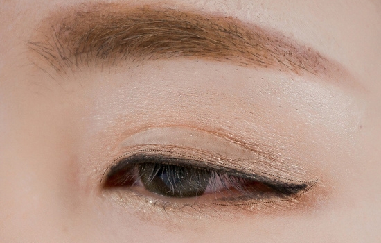 沿着眼睫毛根部画眼线,眼尾稍微上扬一些,再填充睫毛根部有空隙的地方,下眼线画眼尾三角区。