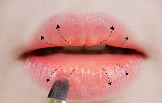 再用唇刷蘸取一些唇膏,从双唇的内侧向外侧涂抹。晕染渐变效果。