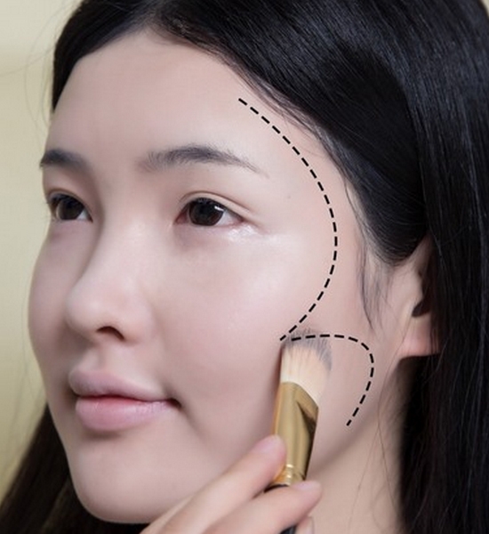 在如图脸部侧边。颧骨部分以画3字的方式轻扫上阴影粉,这样脸会看起来更小哦。