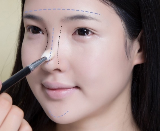 在额头、鼻梁、下巴用粉刷涂抹高光提亮,鼻翼两侧涂抹阴影粉,会使脸部轮廓更立体。