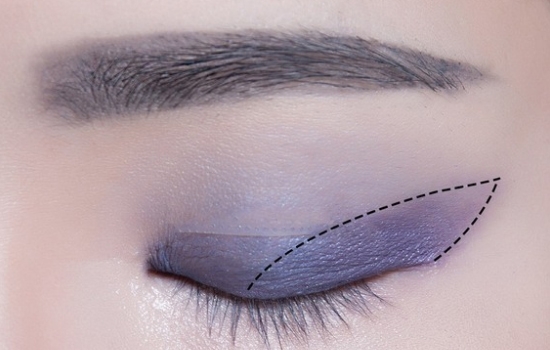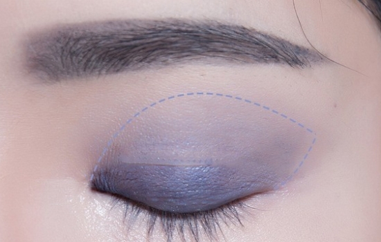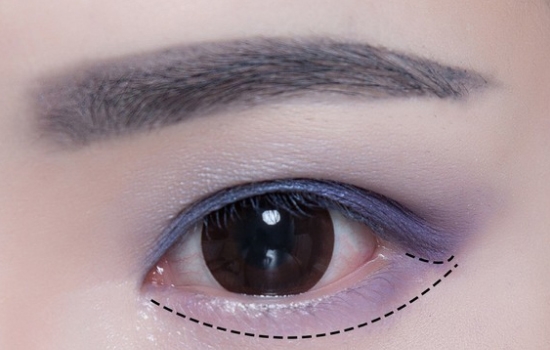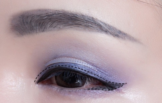 沿着睫毛根部画眼线,前眼头稍微拉长,眼位拉长并上翘,下眼线画后半段(图中虚线)然后向前段稍微过渡,使下眼线更佳自然。