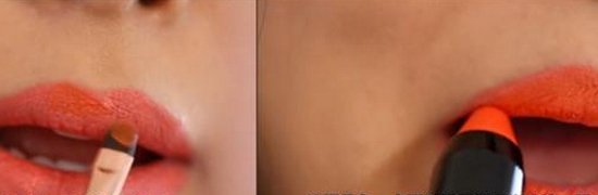 介绍第二种利用唇膏笔和唇膏结合的方法。涂鲜艳颜色的唇膏都希望能更显色,所以先用唇膏笔进行打底。