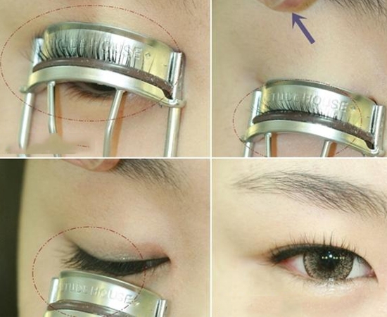 STEP1:把睫毛夹贴近睫毛根部,夹住睫毛,用手把眼皮稍微向上拉,睫毛夹边夹变慢慢向下从根部向外夹。