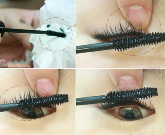 STEP4:刷睫毛前,先把睫毛刷用纸巾轻触几下,去除多余的睫毛膏;用手稍微向上拉眼皮,并且将手指抵在睫毛上方,这样不用担心睫毛膏会刷到眼皮难以擦掉。