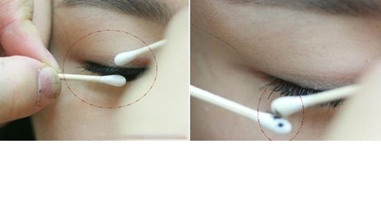 STEP4:刷好后可能会发现睫毛顶端有少量的结块,用两根棉签,把睫毛夹在中间,慢慢去除睫毛膏结块。