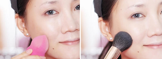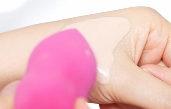 STEP1:把葫芦海绵用水打湿(这样海绵比较容易均匀沾粉而且出来的妆感比较自然轻薄),然后均匀沾取适量粉霜开始上底妆。