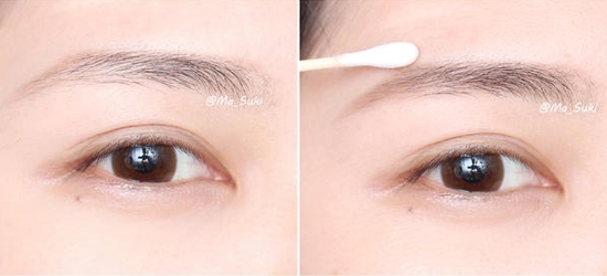 第二步:如果对眉形有其他修改的想法,可以用棉签在眉峰修改弧度,我这里的眉毛棱角太明显,于是我就用棉签在眉峰那里擦得柔和一点。