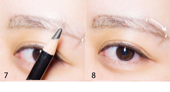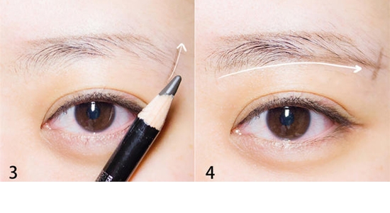STEP4:眉笔在眉毛下方画出自然弧线,与眉尾的线条相交。