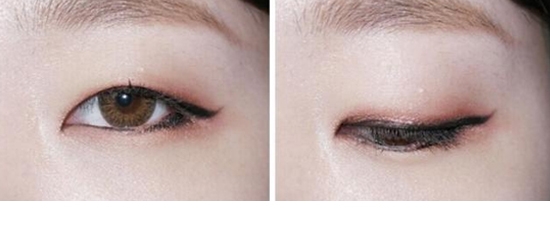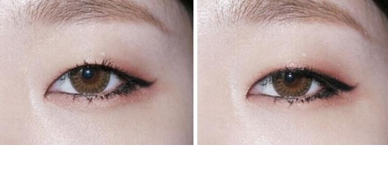 STEP3:紧贴睫毛画好上下内眼线,上眼线眼尾延伸上扬,下眼线眼尾加粗