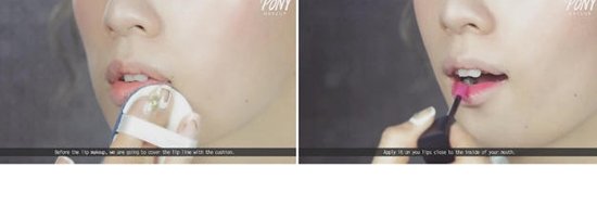STEP18:用气垫粉扑蘸取少量粉底液,轻轻按压在嘴唇轮廓处,模糊边际。