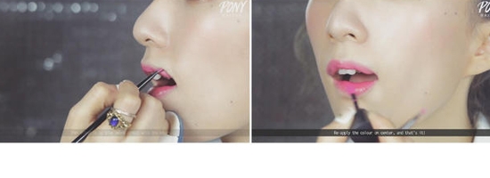 STEP19:在唇部中央涂上玫红色唇釉。