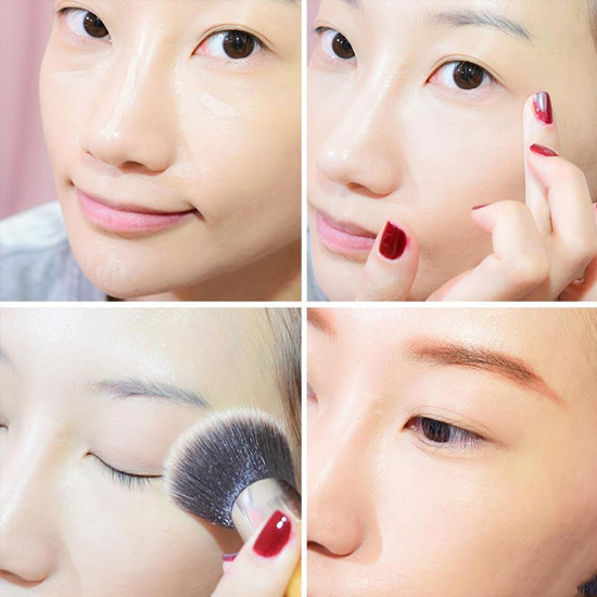 STEP1:用遮毛孔的妆前乳涂抹毛孔粗大部位后,在全脸点上粉底液,用粉底刷仔细刷均匀。