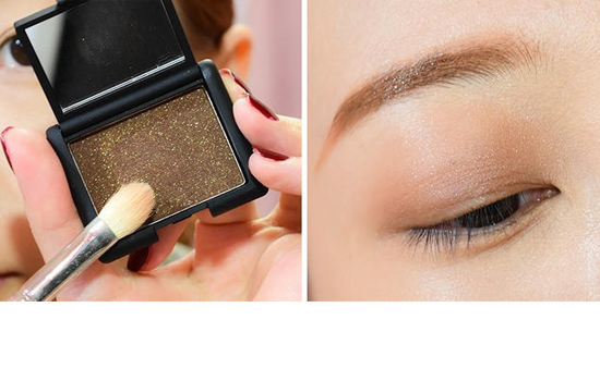 STEP5:用眼影刷蘸取带珠光的金棕色眼影刷在双眼褶皱处,超上方自然晕染开。