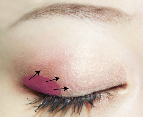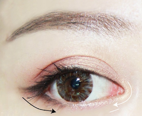 用小拇指沾取浅粉色眼影,沿白色箭头方向打亮眼头。用小号尖头刷的紫色余粉打亮眼头。用小号尖头刷的紫色余粉带到下眼睑,按黑色箭头所示方向与浅粉色眼影混合。