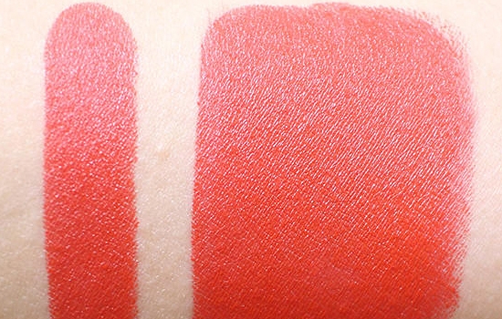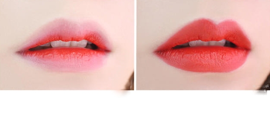左边是咬唇妆,右边是满唇妆,颜色和刚刚介绍的第一款液体唇膏的颜色特别接近,都是那种介于红色和橙色之间的颜色。