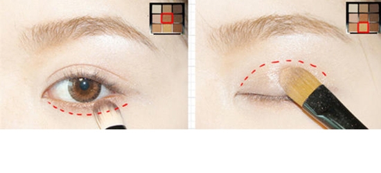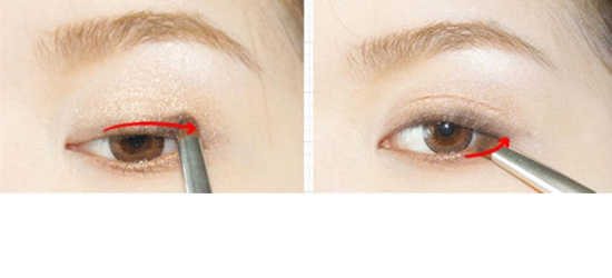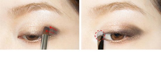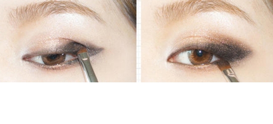 STEP11:用灰色眼影涂在双眼皮褶皱后半部分内,宽度约为一半,注意眼头部分不要涂。