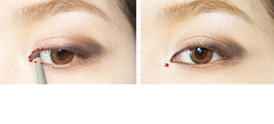 灰色眼影涂眼尾,白色眼影提亮