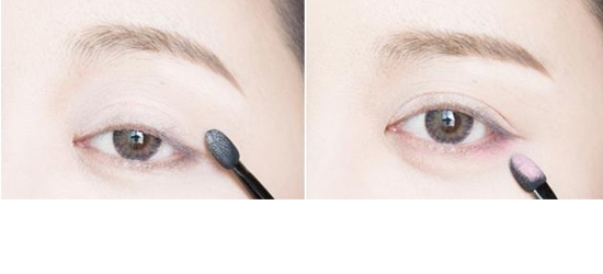 STEP1:用浅粉色眼影在上眼睑涂抹打底,打底的时候,也可以选择用手指涂抹,把深粉色眼影涂抹在下眼睑后1/2位置。