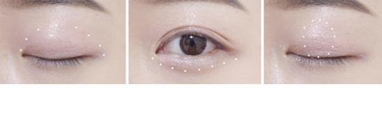 STEP1:用带珠光的淡粉红色眼影涂在上眼睑处打底,稍微显色即可。