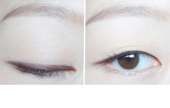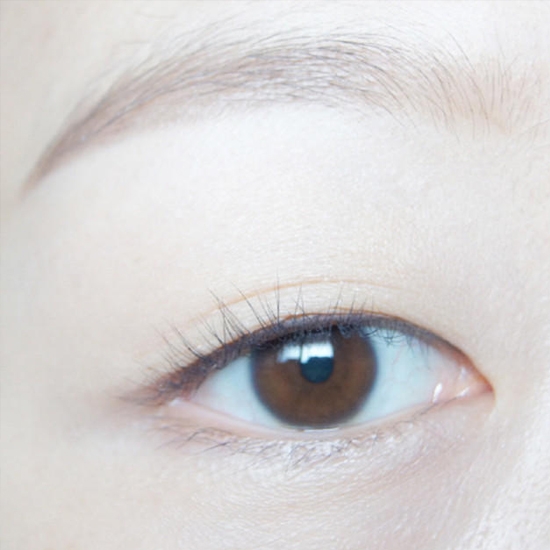 步骤二:用棕色眼线笔沿着睫毛根部描画眼线,眼线造型力求直线型,可以稍微画粗一些。