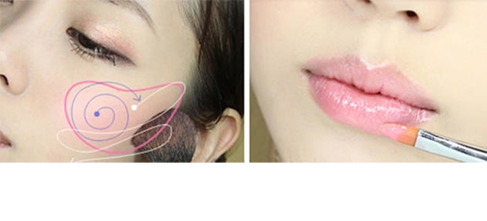 STEP15:用腮红刷蘸取带珠光的粉色腮红粉以画圈的方式涂在苹果肌处,然后再按照白线箭头方向刷上腮红,这样会更自然。
