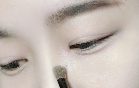 第九步:再用大的晕染刷取浅色眉粉刷一下鼻影,山根的部分可以稍微重一点,会显得鼻子很挺。