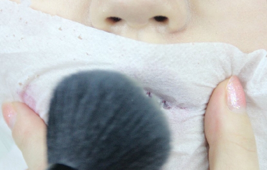 第三步:用纸巾抿掉光泽,重新拿一张薄一点的纸巾,盖在嘴唇上,散粉刷沾取散粉拍在上面。