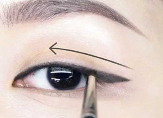 第一步:在基础眼线的基础下,先将眼尾处拉平,再延长眼尾,顺着眼角下方的弧度动线往上拉,比基本眼线多拉5mm。