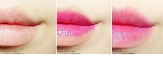STEP6:做好唇部打底,将深粉色唇彩从中间向两边晕开涂抹,打造渐变效果。