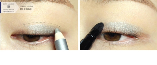 STEP3:用银色眼影笔涂在上眼睑后三分之二的位置处,宽度约为双眼皮褶皱宽。