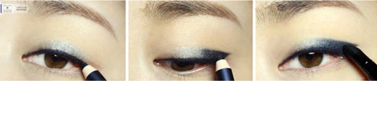STEP6:再用蓝色眼线笔画出眼尾的弧度,要把银色眼影遮盖住。