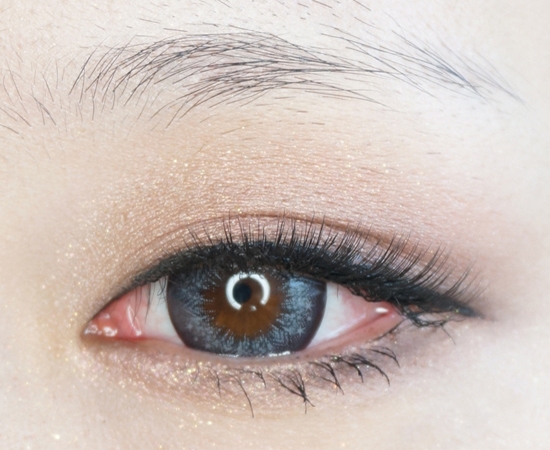 夹翘睫毛,带上纤细自然的假睫毛后,用睫毛膏将真假睫毛粘合。