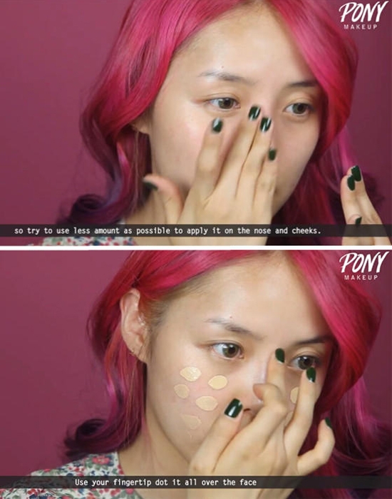 STEP02:用指腹蘸取粉底液轻轻点涂在脸部各个部位。