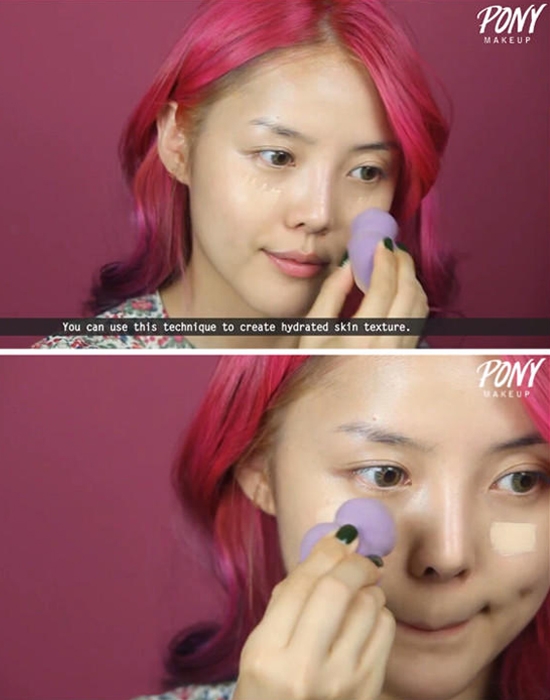 STEP03:用海绵粉扑将粉底液均匀拍打开,打造透明、无暇肌底。