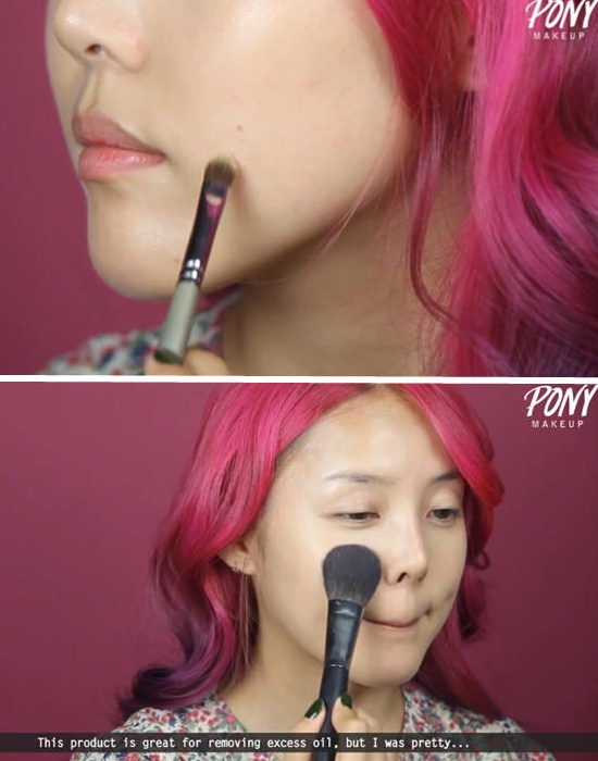 STEP08:用圆头大粉刷蘸取适量散粉,拍打在脸部各个部位,气垫控油、定妆效果。