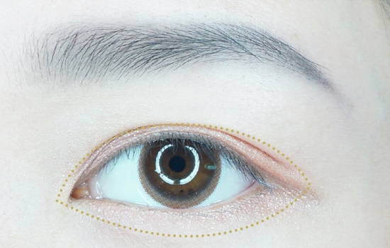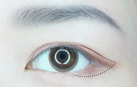 第五步:亮片浅金棕色眼影,刷在上眼皮双眼皮褶皱内和下眼睑,位置如图所示。