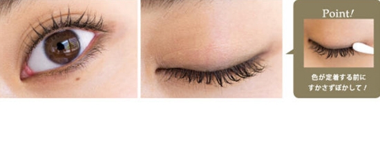 重点:沿着睫毛根部描绘并用棉签轻轻擦拭让它晕染得浅一些,着重强调下眼线后半段。