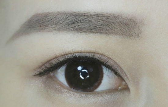 第七步:选择自然棕色交叉款式的假睫毛,贴上,刷上睫毛膏将假睫毛与自然睫毛粘合即可。