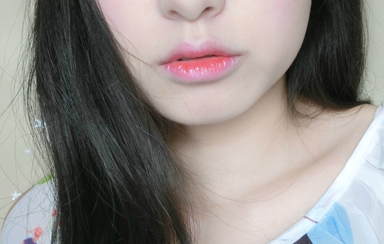 第九步:唇部用粉底液或遮瑕膏打底,薄涂上粉橘色唇釉,用手指将边缘晕染。