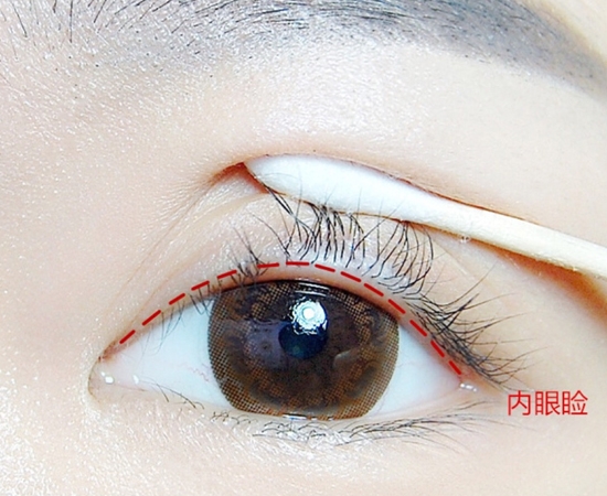 第一步:内眼线究竟画在哪里呢?睫毛根内的内眼睑就是我们应该画内眼线的位置,如图所示,内眼睑是一条白色的肉肉,位于睫毛内层,我们需要用眼线产品将这留白的一条涂满。