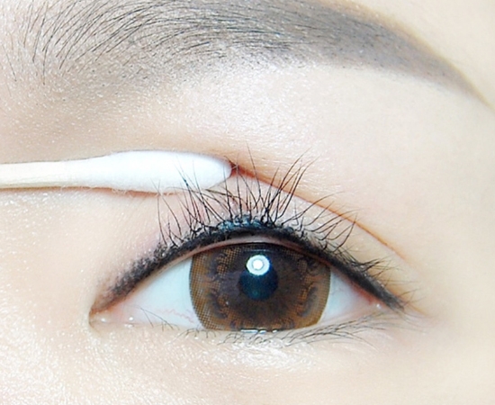 第二步:画不习惯的初学者可以像小编一样用棉签辅助找到内眼睑,建议使用黑色眼线胶笔,轻轻翻起眼皮左右滑动眼线笔填满内眼睑。