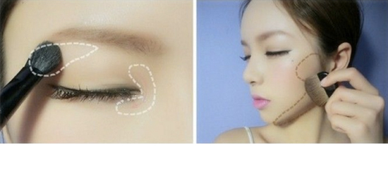 STEP11:左图的眼角区域和眉尾下方用高光眼影,右图两侧脸颊都打上深色修容,让脸部看起来更小。