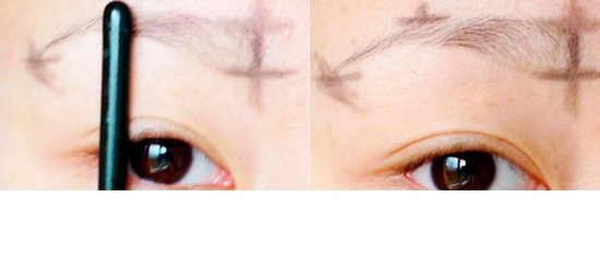 步骤六:确定眉峰的位置。可以自己约莫估计在眉毛的2/3处做记号确定为眉峰,也可以,用小棒子放在与眼珠垂直的方向,如图。这样上面的交点就是眉峰的位置哦。