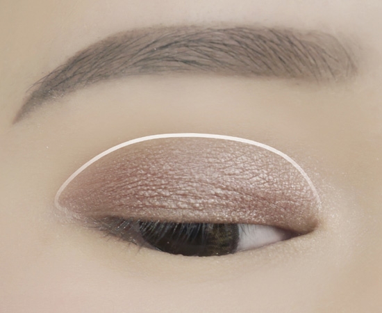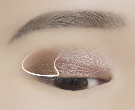 将深棕色眼影涂抹在图中所示区域内,以双眼皮线为基准横向涂抹,中间部分深,接近眉骨的地方颜色要浅。