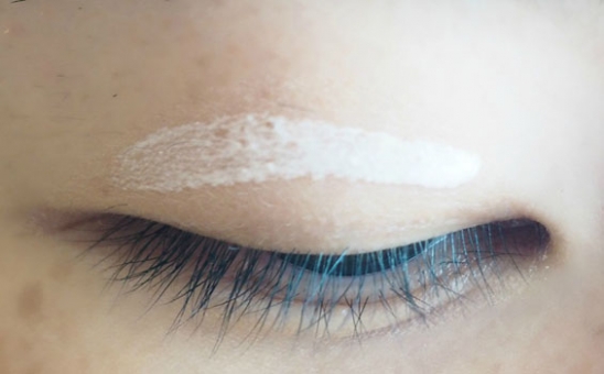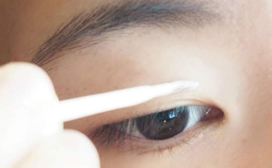 第一步:首先用小刷子沾取双眼皮胶水涂抹在眼皮上,双眼皮胶水容易干,记住不要涂太慢,确定位置后方可涂抹。