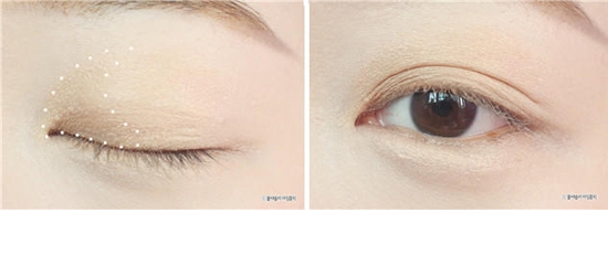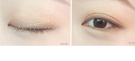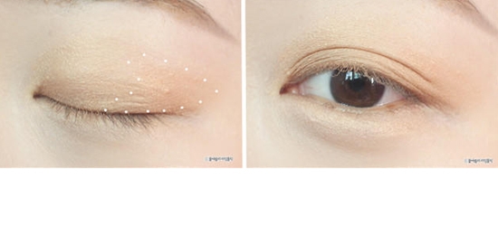STEP3:取适量奶白色眼影涂抹上下眼睑,为眼妆打底。