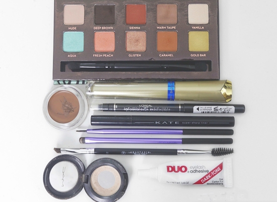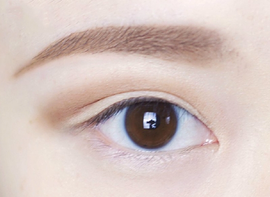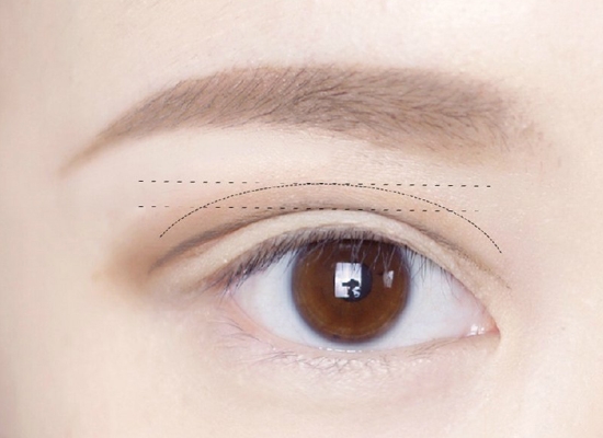 用深褐色眉胶或眼线胶描出假的双眼皮褶皱,这里下手一定要轻一点哦,不然会看起来不自然。以自己原本的双眼皮最高处作为定点去修饰双眼皮褶皱前段和尾端。