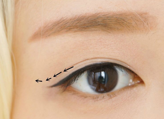 眼线刷沾取黑色眼线膏描绘眼线,眼尾拉长稍微上翘。